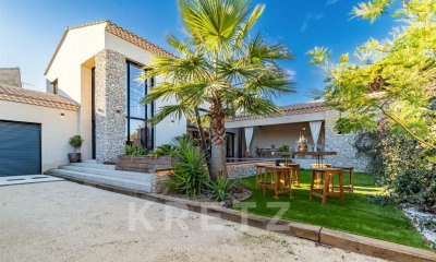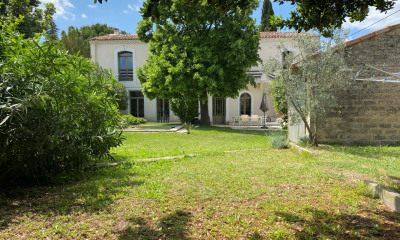 À 20 min de Nîmes, un mas traditionnel gardois du 19e s et ses vastes dépendances rurales. Sur la partie nord-orientale d'un terrain rectangulaire de plus 3 000 m², clos de murs en pierre et de grillages, se dresse une vaste bâtisse ancienne au caractère rural affirmé. L'ensemble bâti s'organise selon un plan en U, fermé sur trois côtés, typique des mas traditionnels du Sud. Ce dispositif architectural, pensé pour protéger des vents dominants et offrir un espace intime autant que fonctionnel, rappelle les fermes qui structuraient autrefois les campagnes gardoises. L'entrée dans la propriété s'effectue depuis l'ouest par une large porte cochère encadrée d'anciennes écuries en pierre. Elle marque le seuil d'un univers clos et tranquille, tenu à l'écart de toute agitation. Derrière la discrète entrée se découvre une cour centrale, vaste et lumineuse, délimitée par les trois ailes de la maison. Les murs, en pierre locale et moellons recouverts d'un enduit patiné, attestent l'ancienneté de l'ensemble - probablement antérieur au 19e s. Les baies sont droites, pour l'essentiel ; certaines, larges et hautes, sont à arc surbaissé ou en anse de panier, en rez-de-jardin. Toutes sont encadrées de pierre de taille. Les toitures, récemment rénovées, sont en tuiles canal posées sur des charpentes en bois à double pente et bordées de génoises à deux rangs ; elles présentent des décrochements qui témoignent des extensions et des évolutions successives de l'ensemble bâti au fil des générations. La cour, revalorisée par l'ajout récent d'une piscine, évoque l'ancienne fonction productive des lieux tout en soulignant sa transformation en un espace de vie dont l'élégance a été travaillée. Dans les ailes, autrefois greniers ou dépendances agricoles, quelques percements laissent entrer la lumière et autorisent à en redéfinir les usages. Orienté plein sud, le corps principal, qui capte la chaleur et la lumière méditerranéennes, offre quant à lui, à travers ses nombreuses baies, de larges vues sur l'espace intérieur de la propriété.
