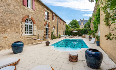 À l'extérieur, la propriété révèle une cour intérieure intimiste, à l'abri des regards, pouvant accueillir un bassin ou une piscine. L'ensemble constitue un véritable havre de paix en plein centre urbain.