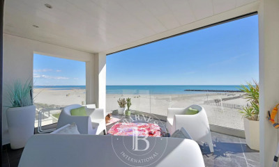L'accès se fait par un palier privatif, garantissant calme et intimité. L'appartement développe plus de 105 m² habitables et s'ouvre sur une belle pièce de vie lumineuse, prolongée par une terrasse de 20 m² offrant une vue mer dégagée. La cuisine ouverte, entièrement équipée, allie design contemporain et fonctionnalité, avec des équipements haut de gamme : machine à café encastrée, four Miele, micro-ondes Bosch, cave à vin EuroCave, et mobilier sur mesure signé RBC, reconnu pour son design d'intérieur haut de gamme à Montpellier.