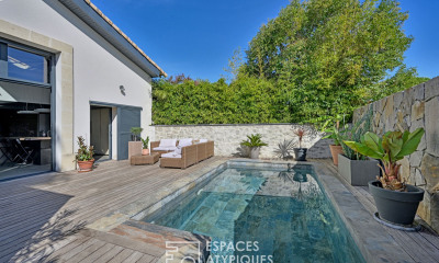Dès l'entrée un hall s'ouvre sur une pièce de vie d'environ 58 m² augmentée d'une magnifique véranda parquée de 47 m2, baignée de lumière, et offrant une vue dégagée sur la terrasse, l'espace piscine en pierre de Bali et jacuzzi.