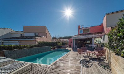 À l'extérieur, la villa se fond dans un écrin verdoyant, avec des essences méditerranéennes qui parfument l'air. Le bassin de nage de 8 mètres de long, tableau aquatique, invite à la véritable détente et à la contemplation, tandis que les vastes espaces extérieurs se transforment en un lieu de vie privilégié, idéal pour savourer les moments en famille ou entre amis.