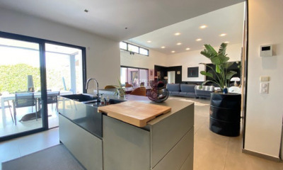 Le cœur de la maison s'articule autour d'un vaste espace de vie d'environ 65 m², ouvert sur le jardin et la piscine grâce à de larges baies vitrées. Une véritable continuité dedans-dehors s'installe, idéale pour recevoir, partager des moments en famille ou profiter pleinement des saisons. La cuisine sur mesure, au design soigné, allie élégance et fonctionnalité, parfaite pour les amateurs de convivialité et de belles finitions.