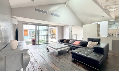 À l’étage, l’espace de vie principal s’inscrit dans un esprit loft contemporain et offre des volumes spectaculaires. Un séjour cathédrale baigné de lumière s’ouvre sur les terrasses et dispose d’une cuisine conviviale avec cellier-buanderie.