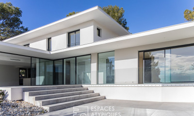 Une grande partie du mobilier est intégré, directement conçu dans les murs ou les volumes. La propriété dispose également d’une réserve d’eau de pluie de 30 000 litres et d’un puits canadien permettant de rafraîchir l’une des habitations