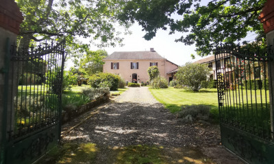 La propriété orientée plein sud s'étend sur près d'un hectare de terrain en pente douce, aménagé avec soin au fil des années. Elle comprend une maison principale, un grand cottage d'invités entièrement rénové, une piscine avec de vastes terrasses couvertes, ainsi qu'un charmant étang à poisson.