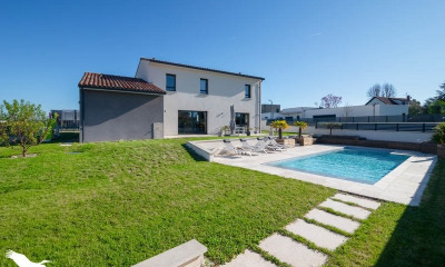 Édifiée sur un terrain paysager de plus de 2 200 m², la propriété offre un extérieur soigneusement aménagé, mêlant végétation généreuse, multiples terrasses et une piscine à effet miroir, idéale pour les moments de détente comme pour les réceptions.