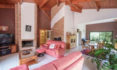 Dans la maison, vaste pièce à vivre composée d'un séjour et salle à manger ouverts autour d'une cheminée insert double face, une cuisine dînatoire premium avec un cellier attenant, un salon TV / bibliothèque, 1 master suite de 40m2 avec de grandes ouvertures sur le parc arboré (dressing, salle d'eau avec double douche, et 1 wc privatif), 1 bureau et 1 wc indépendant complètent ce niveau.