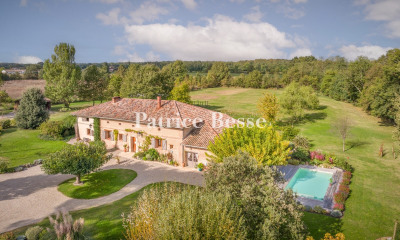 Dans le département du Lot, à proximité du coeur historique de Cahors, une maison de maître, son parc, sa piscine et sa vue panoramique. L'accès à la propriété s'effectue via un grand portail inséré dans la clôture d'enceinte, qui débouche sur une allée gravillonnée. Celle-ci conduit à un carport fermé où peuvent stationner plusieurs véhicules. Un parc arboré d'environ 3 000 m², dessiné avec sobriété, mêle charmilles, cognassiers, glycines et buis en pot ainsi qu'un bassin, des vasques, une fontaine, des tonnelles et des rotondes. Il entoure la maison de ses arbres et massifs fleuris. Les allées de promenade sont couvertes de gravillons. La demeure, construction typique du 19e s., suivant un plan globalement rectangulaire avec petit retour en L, se dévoile au bout de la plus grande d'entre elles. Élevée de trois niveaux dont un de combles, elle est surmontée d'un toit de tuiles romaines à deux pentes, sauf au niveau du retour, où la toiture présente en sus un troisième pan. Ses façades principales sont orientées au sud, côté parc, et à l'ouest, côté fleuve, ce qui lui garantit de nombreuses heures d'ensoleillement. Bâties en pierre blonde du Quercy, elles sont percées de larges baies dont certaines cintrées, la façade nord se distinguant des autres par deux baies vitrées, l'une cintrée, l'autre pleine d'une menuiserie traitée à la façon d'une verrière. Elles sont enduites en gris clair, sauf au niveau des encadrements de baie, des chaînages d'angle, du soubassement et de la corniche, en pierre de taille. Un perron qui intègre un escalier en pierre à double volée symétrique bordé de rampes à barreaux en fer finement ouvragé, avec divers motifs végétaux à leur base et en leur sommet, surplombe une volière. En outre, une 'ruelle' empierrée traverse le bâtiment au rez-de-chaussée, du nord au sud, et donne accès aux caves, atelier et abris de jardin situés sous le logis.