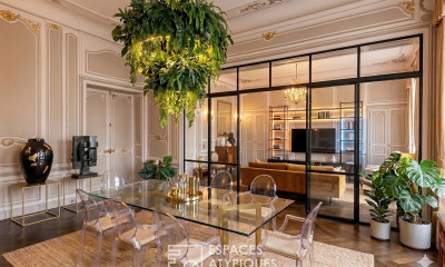 Derrière les hautes portes majestueuses, le double salon de 80m2 invite à la réception et au partage.