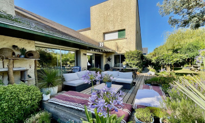 A l'extérieur, le jardin s'étend largement autour de la maison. La terrasse récente trouve naturellement sa place, tandis que la piscine chauffée et sécurisée se fond dans un décor simple et agréable. Les panneaux photovoltaïques et les travaux récents témoignent d'un entretien suivi et d'une maison modernisée au fil du temps.