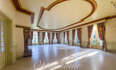 Sur la droite, un grand salon traversant, lumineux (32 m²). Au sol, carrelage identique au hall d'entrée, boiseries, poutres apparentes et une très belle cheminée en bois.