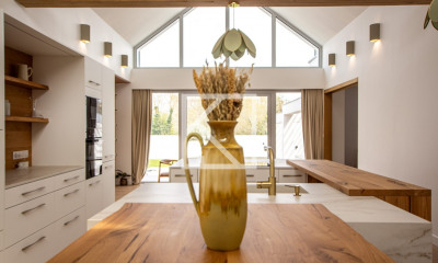La cuisine récente, à la fois esthétique et fonctionnelle, se distingue par sa verrière qui crée une perspective élégante depuis la pièce de vie. Elle bénéficie d'une vue directe et d'un accès de plain-pied au jardin, invitant naturellement à la vie dedans-dehors.