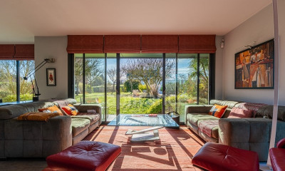La maison dévoile une vaste pièce de vie baignée de lumière, où se conjuguent lignes épurées et atmosphère chaleureuse.