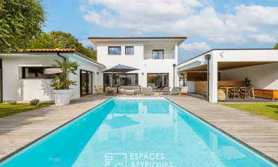 À l'arrière, le jardin se fait plus intime. Une terrasse élégante s'ouvre sur la piscine, parfaitement intégrée dans son écrin de verdure, offrant un lieu privilégié pour savourer les beaux jours, à l'abri des regards.