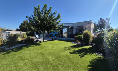 À l'extérieur, tout est réuni pour profiter des beaux jours : piscine chauffée de 5x9 m, vaste terrasse de 60 m² avec cuisine d'été, jardin paysager aux accents méditerranéens (palmiers, olivier sculpté, plantes grasses) et garage de 32 m².