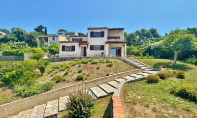 Édifiée sur un magnifique terrain en restanques de 4 167 m² planté d'oliviers centenaires, la propriété bénéficie d'une exposition Ouest et d'une vue imprenable sur la mer, les Îles de Lérins et le massif de l'Estérel.