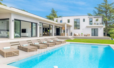 La suite principale constitue un véritable havre de paix, séparée par un patio, et comprend un salon, une chambre, un dressing et une salle de bains attenante. La maison offre également quatre grandes chambres doubles, chacune avec sa salle d’eau privative et un accès direct au jardin, garantissant confort et intimité à tous.