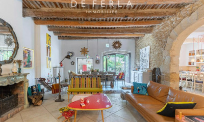 L’intérieur de 300 m2 est réparti sur 3 niveaux lumineux et spacieux, idéalement répartis autour d’un escalier central et magnifiés sur l’ensemble par des hauteurs de plafond de 3,20 m. Le hall d’entrée s’ouvre à l’Est sur un double séjour de plus de 80 m2, un séjour intérieur avec grande cheminée et plafond à caisson, suivi d’une orangerie à larges baies vitrées ouvertes sur une large terrasse, pelouse et la colline boisée. À l’Ouest, un bureau orné d’une cheminée en marbre rouge du Languedoc, et d’une grande cuisine aménagée ouvrant au Nord sur une terrasse abritée d’une tonnelle.