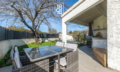 Deux terrasses, l'une bordant la piscine, l'autre devant la pièce de vie, offrent des lieux de détente propices aux douces soirées d'été.