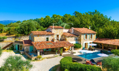 Une vaste terrasse en travertin de plus de 200 m² entoure une superbe piscine 8x4 m avec plage immergée, un terrain de boules et plusieurs espaces de détente, dont une cuisine d'été équipée (four à bois, évier en pierre de Cassis, frigo, plaque de gaz).
