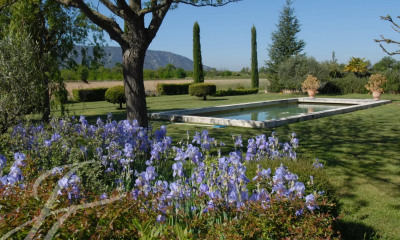 Le jardin est entièrement à l?abri des regards, clos de murs et de haies parfumées d?éléagnus. Il est planté d?essences locales, notamment de chênes verts et blancs, de lauriers-roses, d?oliviers et de lavande, fidèle à la nature provençale. À l?arrière de la cuisine se trouvent : un jardin d?herbes aromatiques, un espace repas ombragé, une plancha et un bûcher. La superbe terrasse d?accueil, ombragée par une pergola couverte de vigne vierge, vous reçoit à l?arrivée. De là, marches et allées vous conduisent vers la piscine, sécurisée par une couverture électrique récemment installée. Avec un banc de pierre ici, une fontaine là, des zones engazonnées et des recoins ombragés, le jardin se prête idéalement à la vie de famille, offrant de nombreux espaces pour jouer et se détendre (dont une cabane en bois).