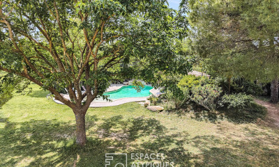 Le parc paysager, pensé comme un écrin de verdure, vous séduira par sa diversité et son harmonie: passé le vaste parking avec double garage, un portail en fer forgé ouvre sur une cour intérieure verdoyante et intimiste avec sa grande terrasse couverte (soustet en provençal) idéale pour les repas d'été ; un espace piscine bien protégé avec son bassin de 15 x 5 m et sa terrasse ombragée ; plus loin, un jardin ombragé par de grands arbres et un verger aux essences méditerranéennes (oliviers, pruniers, cerisiers, pommiers, abricotiers) rythmé par les saisons dans une atmosphère bucolique.