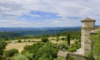 L’extérieur est tout aussi remarquable : trois vastes terrasses à l’italienne, successives et À LA VUE panoramiques, dont la première abrite un espace couvert avec barbecue, un ancien four à pain et un bassin à remettre en eau. Sur les terres, un magnifique colombier/pigeonnier d’époque vient rappeler l’histoire et l’authenticité du lieu.