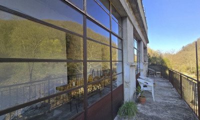 ET une MAGNIFIQUE SALLE VOUTÉE (232m²), jadis salle des machines où les ouvrières s'activaient à filer le fil de soie. Elle se situe au dessous du RDC, elle a de grandes ouvertures donnant sur l'orangerie (38m²) et un balcon filant dominant au plus près la rivière.
