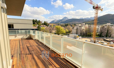 une entrée avec placards intégrés, une cuisine équipée de 10,86 m2, ouverte sur le salon séjour de 28,4 m2 donnant sur la terrasse dallée sur plot équipée d'un barbecue et point d'eau avec vue sur les montagnes, la ville et le parc de copropriété, un dégagement, trois chambres avec placards dont une de 14,58 m2, donnant sur la terrasse principale de 43,43 m2 et deux de 12,88 et 11,5 m2 sur une terrasse de 7,92 m2 exposée nord, une salle d'eau avec lave-mains et emplacement machine à laver, une salle de bains avec baignoire, meuble vasque et radiateur sèche-serviette et un WC indépendant,