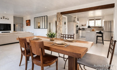 Dès l'entrée, le regard est immédiatement attiré par un volume exceptionnel et une perspective ouverte sur le paysage. Le niveau principal de plain-pied développe un vaste espace de réception de 86 m², entièrement tourné vers l'extérieur grâce à de larges baies vitrées qui encadrent le panorama comme un tableau vivant. L'espace cuisine habillé d'une pierre d'exception a été conçu comme un espace de travail et de partage. Ce rez-de chaussée se prolonge naturellement vers plusieurs terrasses offrant des espaces de vie extérieurs pour tous les moments de la journée, la piscine chauffée sécurisée et le grand jardin plat, créant une continuité harmonieuse entre intérieur et extérieur.