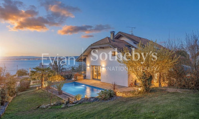 A Maxilly-sur-Léman, à 4 km du centre d'Evian-les-Bains, de ses commerces et du port et 3 km du lac Léman, au calme, sur un terrain de 1519 m2, en partie en pente et non clos, piscinable, avec aire de stationnement goudronnée et le reste en pelouse, édifiée en 1990, une villa indépendante, de construction traditionnelle, d'une surface habitable de 149,90 m2 habitable et 204 m2 utiles, composée de 6 pièces principales, lumineuse, en bon état intérieur et extérieur, à remettre au goût du jour, elle comprend :