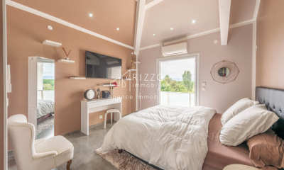 À l'étage supérieur, l'espace nuit accueille quatre chambres spacieuses, dont une suite parentale de 45 m² avec salle de bain privative, baignoire balnéo, douche à l'italienne, dressing, WC et un balcon. Une seconde salle de bain avec baignoire, douche et WC complète ce niveau.