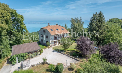 A Maxilly-sur-Léman, à proximité du centre d'Evian-les-Bains, des commerces, du port, et du lac Léman, au calme, sur un terrain de 1519 m2, en partie en pente et non clos, piscinable, avec aire de stationnement goudronnée et le reste en pelouse, édifiée en 1990, une villa indépendante, de construction traditionnelle, d'une surface habitable de 149,90 m2 habitable et 204 m2 utiles, composée de 6 pièces principales, lumineuse, en bon état intérieur et extérieur, à remettre au goût du jour, elle comprend :