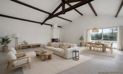 La pièce de vie bénéficie d'un séjour cathédrale avec près de 5 mètres de hauteur sous plafond, mis en valeur par une charpente apparente, apportant un cachet réel à l'ensemble tout en conservant une atmosphère contemporaine.