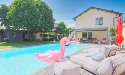 Dès l'entrée, vous serez séduits par une vaste pièce de vie lumineuse d'environ 70 m², comprenant un séjour et une cuisine moderne haut de gamme, l'ensemble ouvert sur l'extérieur grâce à une grande baie vitrée à galandage, donnant accès à la terrasse et à la piscine.
